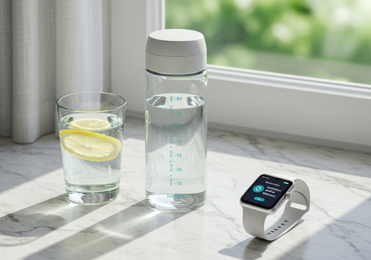 팁: 물병에 눈금 표시를 하거나, 스마트 워치/앱으로 물 섭취 기록하기
